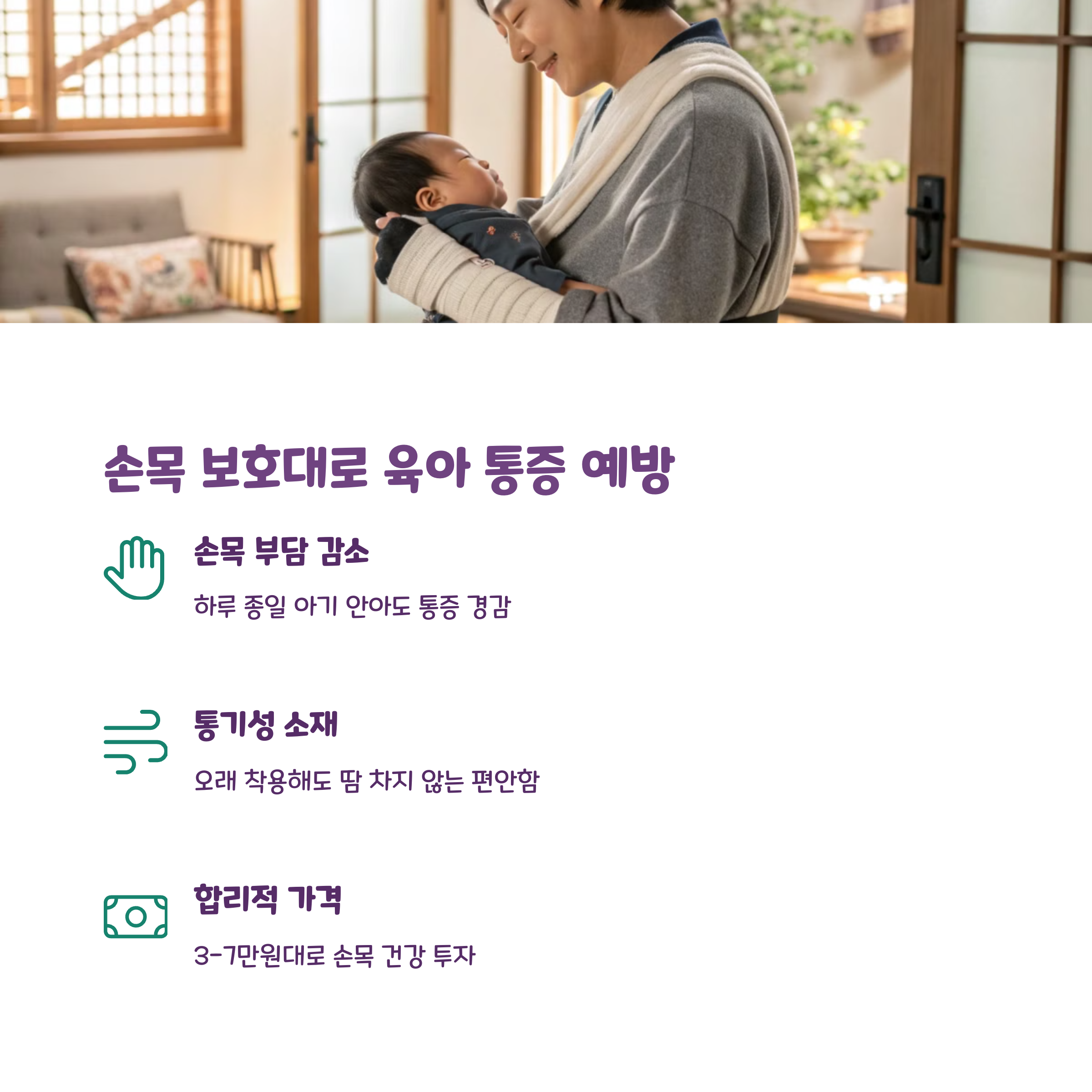 마지막 다섯 번째 추천템은 손목 보호대입니다. 아기를 자주 안아야 하는 육아 과정에서 손목 통증을 호소하는 부모님들이 많습니다. 손목 보호대는 이러한 통증을 예방하고 손목 부담을 줄여주는 역할을 합니다. 엄마 아빠 모두 사용할 수 있어 육아 부담을 함께 나누는 데 효과적이며 실제 사용자들은 착용 후 통증이 완화되었다고 평가합니다. 작은 아이템 하나로 육아 스트레스를 줄일 수 있는 실용적인 선택입니다.