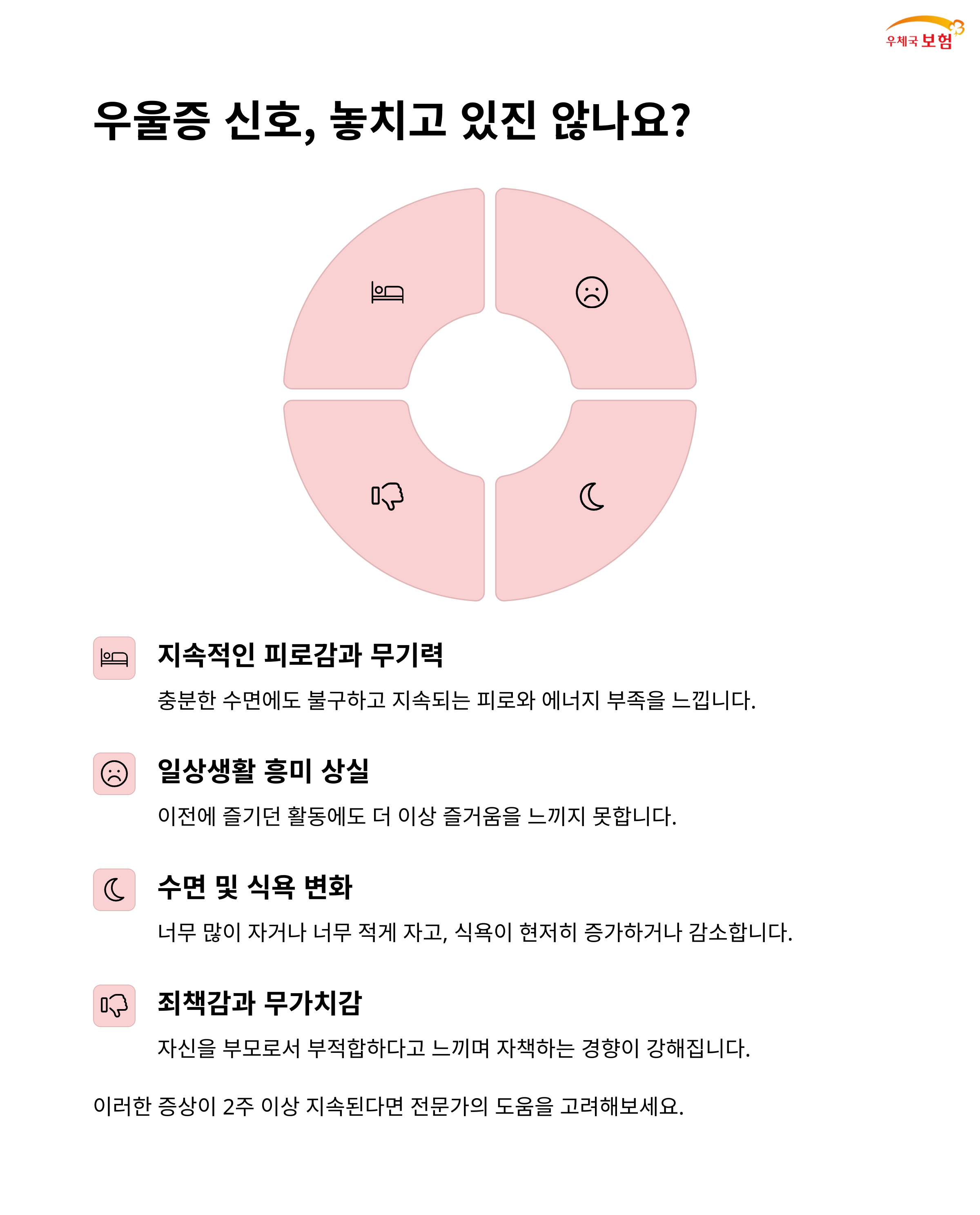 심리 전문가들은 다음과 같은 자가진단 항목을 통해 육아 우울증 여부를 점검하라고 권장합니다. 최근 2주 이상 아래 항목 중 5개 이상 해당된다면, 전문가의 상담을 받아보는 것이 좋아요.