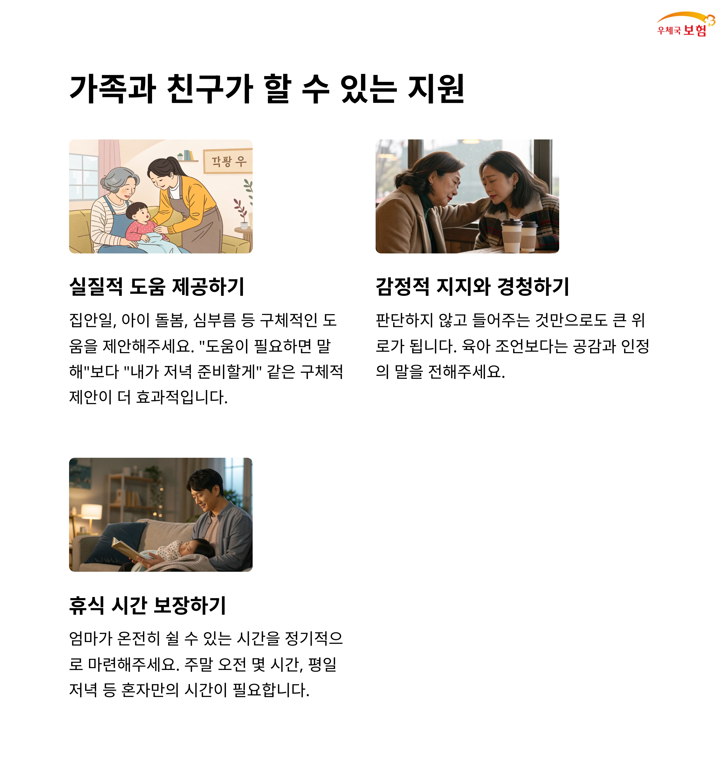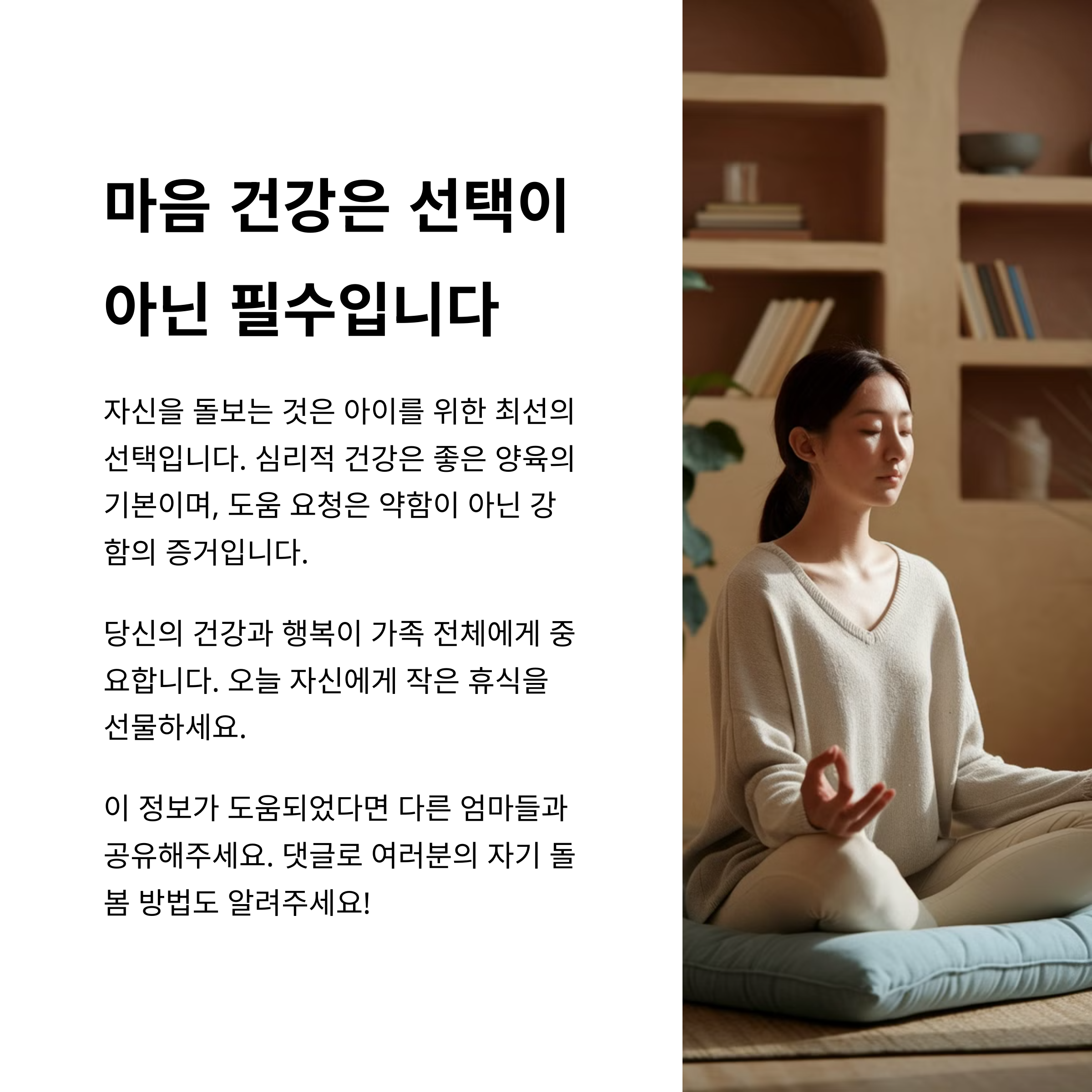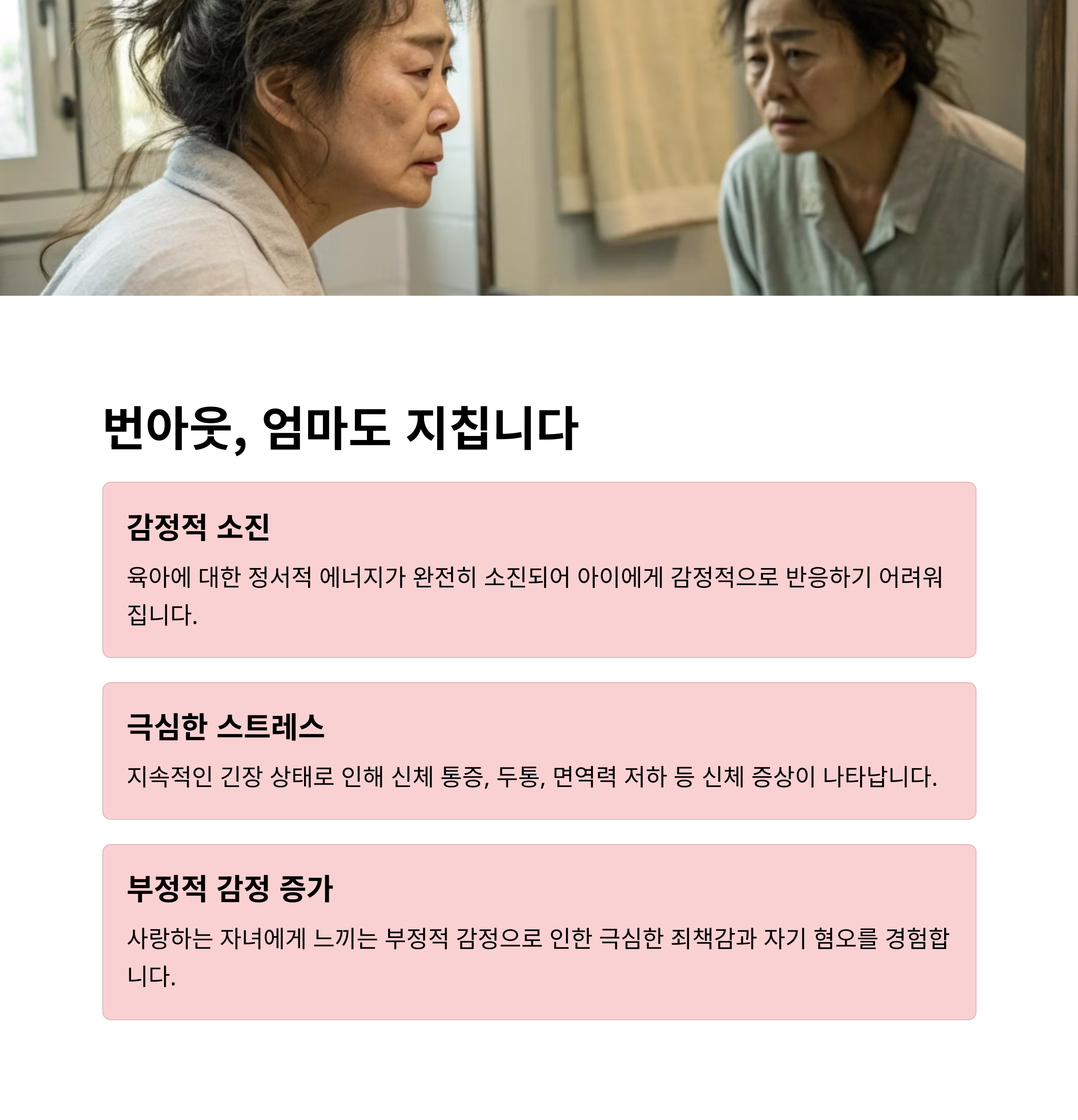 독박육아는 단순한 육체적 피로를 넘어서, 정신적인 고립감과 무력감을 불러일으킵니다. 매 순간 아이에게만 집중해야 하는 환경은 엄마라는 존재의 경계를 모호하게 만들죠. '엄마니까 참아야지'라는 내면의 속삭임은 점차 자신을 억누르고, 결국 깊은 우울감이나 번아웃 증후군으로 이어질 수 있어요. 이처럼 육아 스트레스는 무시할 수 없는 심리적 문제로 발전하며, 본인의 삶뿐만 아니라 가족 전체의 정서적 안정에도 영향을 미칩니다.