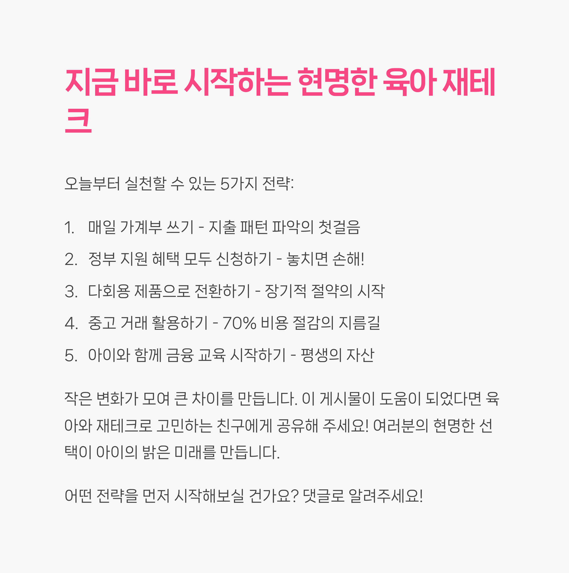 오늘 알려드린 육아 재테크 전략은 누구나 실천 가능한 현실적인 방법들입니다. 다회용 육아용품, 체계적인 가계부 작성, 그리고 정부 지원 혜택까지 하나하나 실천해 나가면 매달 나가는 비용의 부담을 확실히 줄일 수 있습니다. 특히 초보 부모님이나 맞벌이 부부라면 작은 절약이 모여 미래의 재정 자유로 이어질 수 있습니다. 중요한 것은 당장의 절약보다는 지속 가능한 소비 습관을 만들어 나가는 것입니다. 오늘부터 가계부 앱을 설치하고 하루의 소비를 기록해보세요. 그리고 주말에는 사용하지 않는 육아용품을 중고 마켓에 내놓아 추가 수입도 만들어보시길 바랍니다. 육아와 재테크, 결코 둘 중 하나를 포기하지 않아도 됩니다. 여러분도 충분히 육아비용 절감과 가계부 절약 모두 성공할 수 있습니다.