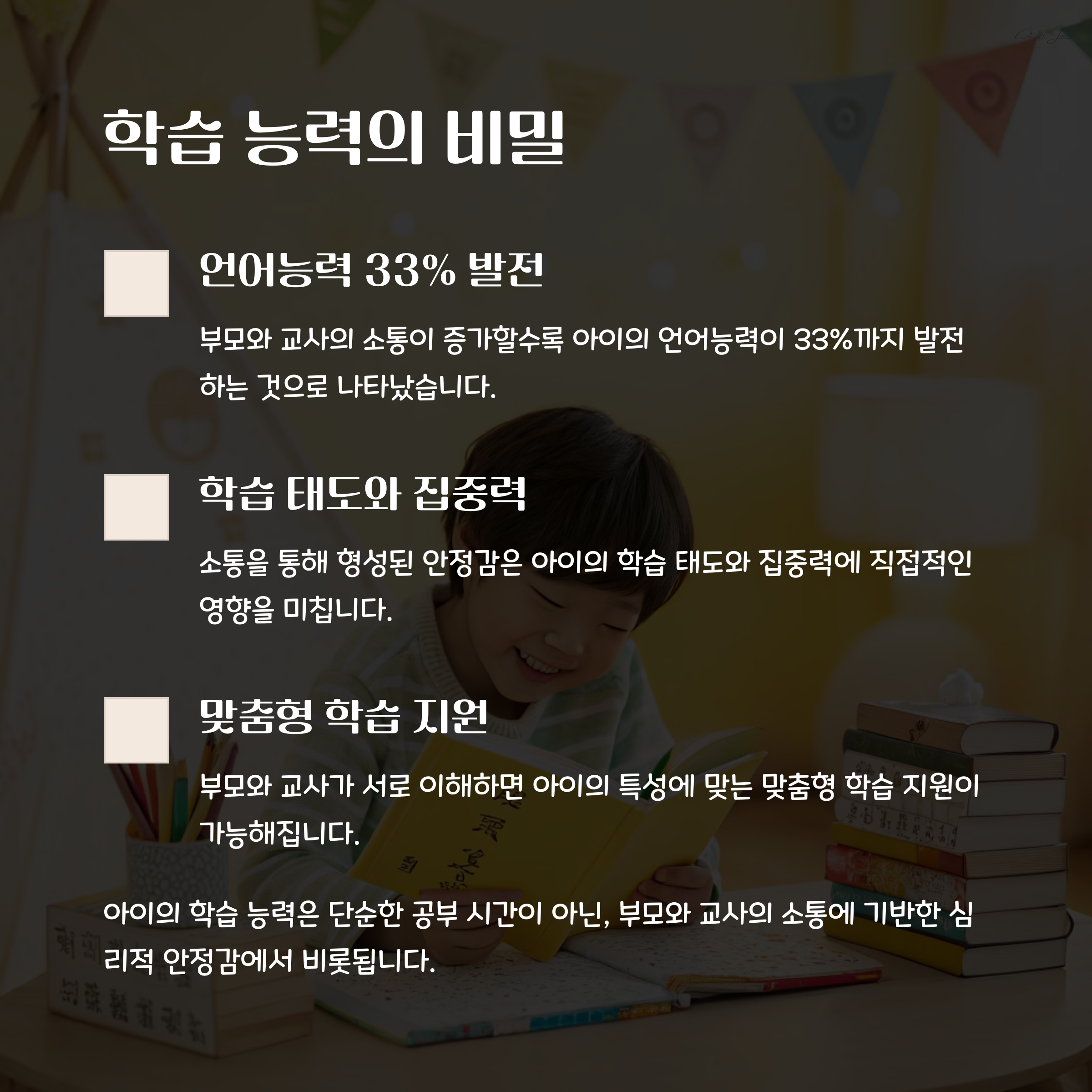애가 공부를 못 해서 학원만 돌린다고 답이 아니더라구요;; 부모와 교사가 손발 척척 맞을 때 아이는 자기조절력, 집중력까지 확 올라간다는 사실! 특히 자기주장력과 과제수행력은 소통이 잘 되는 환경일수록 훨씬 더 잘 자란다는 연구 결과도 있어요.