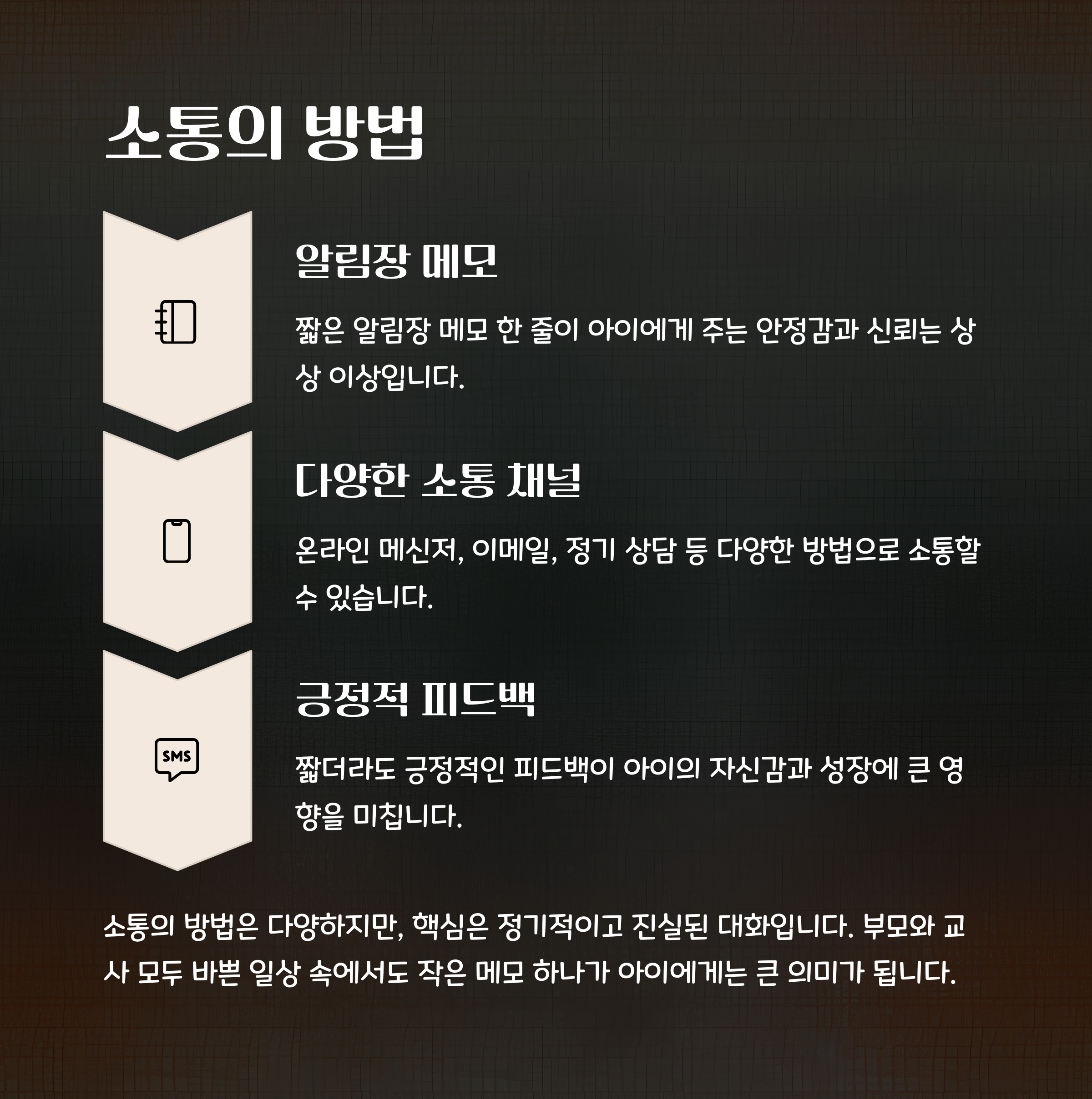 시간이 없으면 짧고 간단하게! 알림장에 한 줄 메모, 카톡으로 짧은 질문 한 번이라도 보내보세요. 지속적으로 소통하려는 태도 자체가 더 중요해요.
