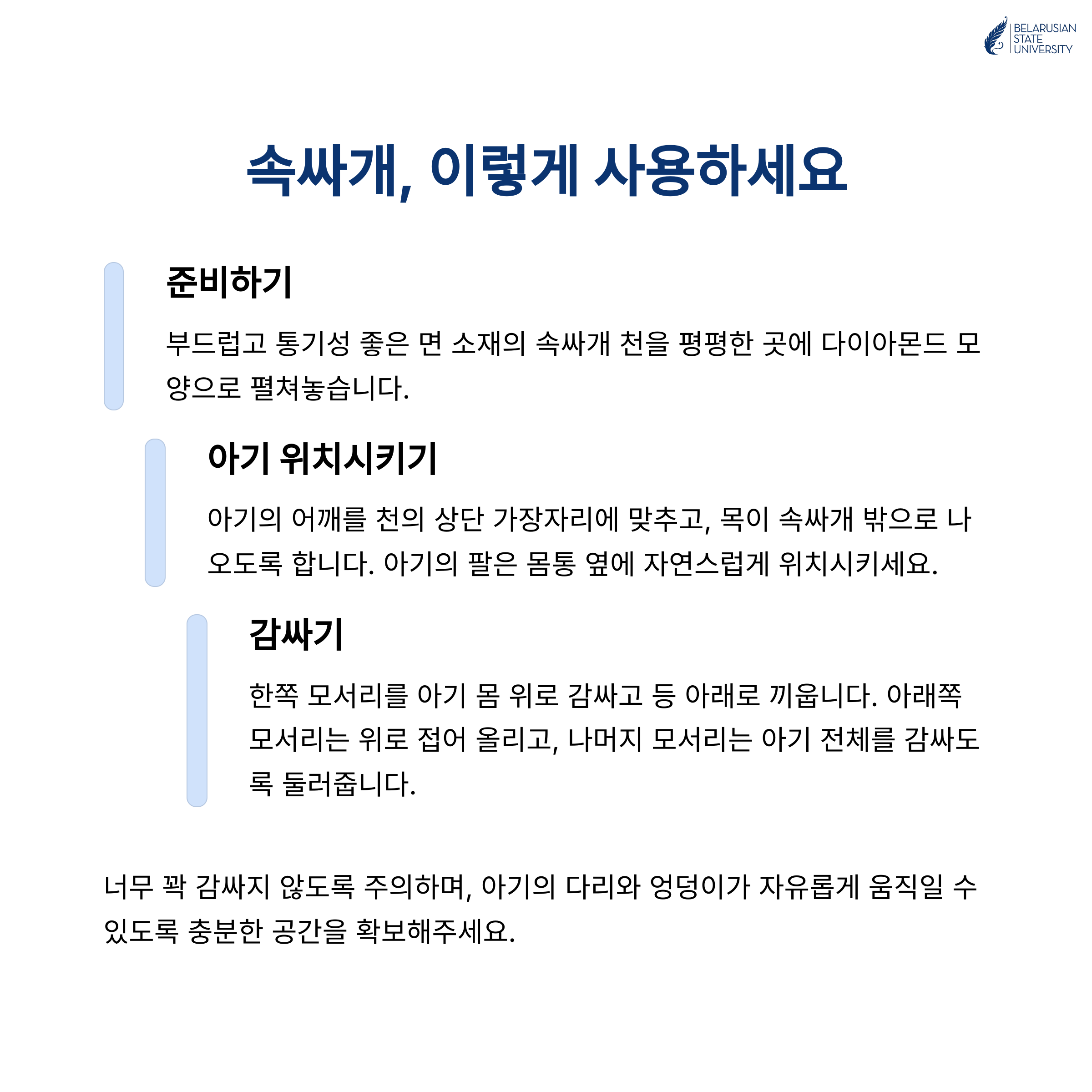 또한, 너무 꽉 조이는 속싸개는 아기의 고관절에 무리를 줄 수 있으니 주의해야 해요. 전문가들은 속싸개 사용 시 다리를 자유롭게 움직일 수 있는 공간을 남기고, 팔은 살짝 고정되도록 감싸는 것이 이상적이라고 조언합니다.