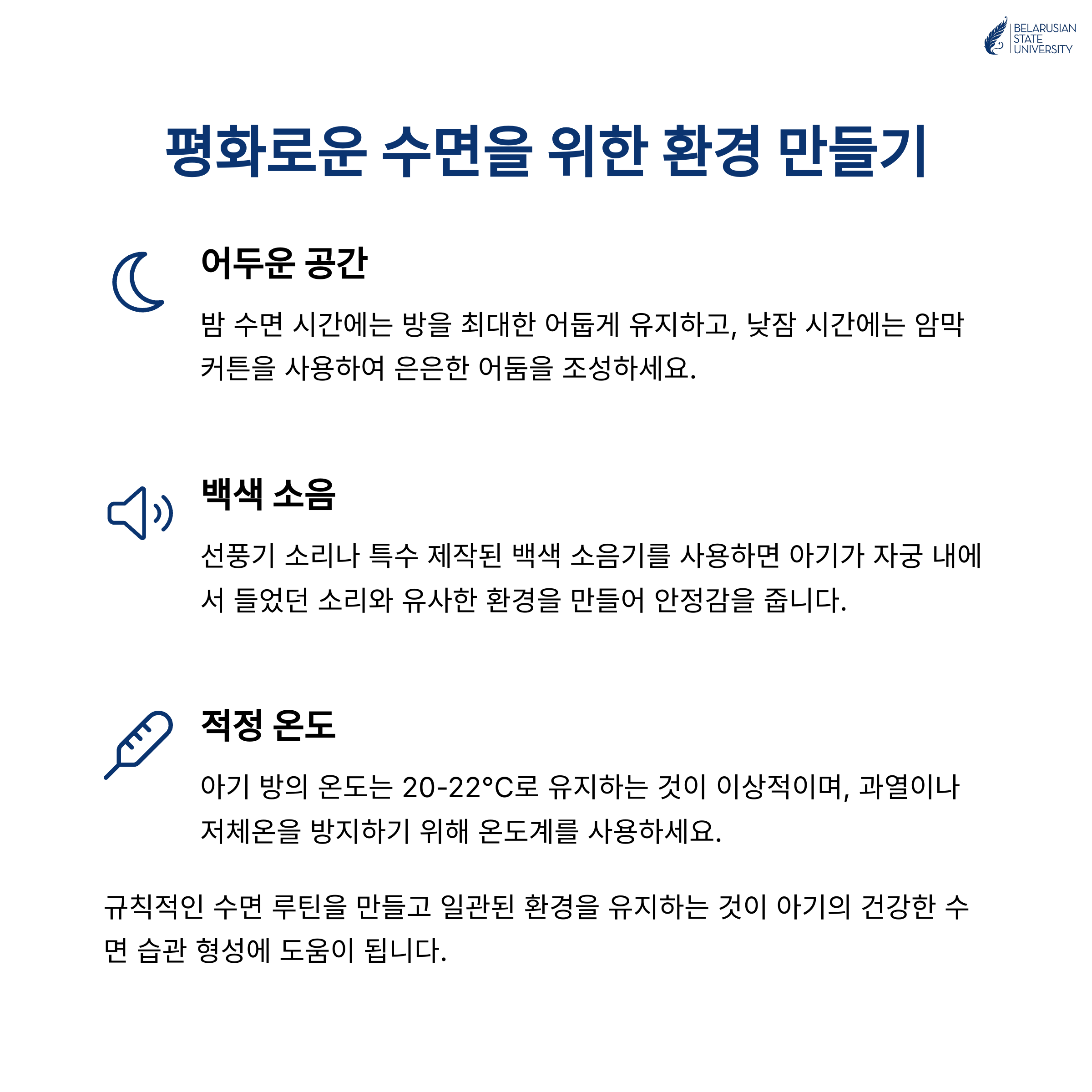 - 수면 환경 조성: 조용하고 어두운 공간, 안정된 온도 유지, 급격한 자극 피하기!