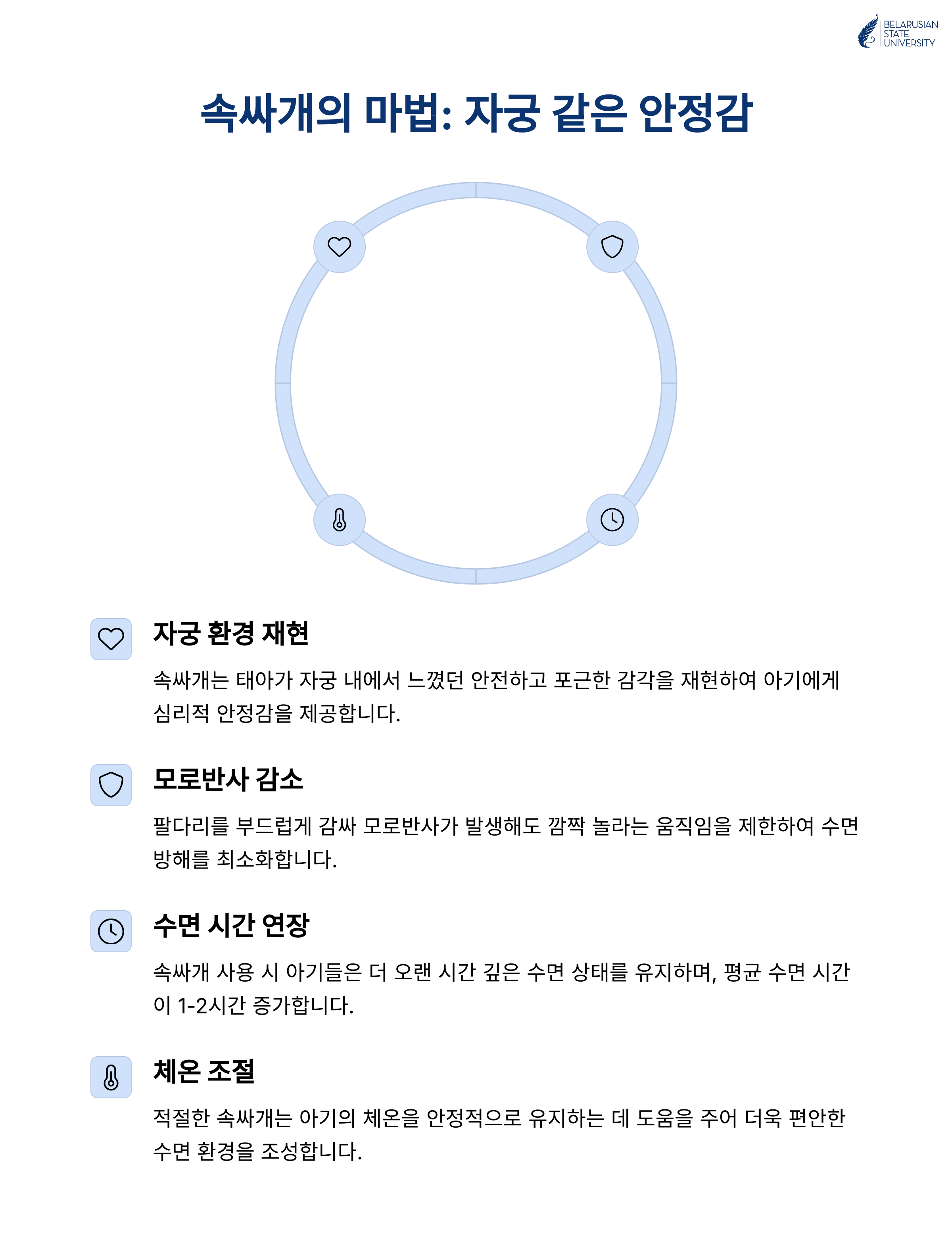 속싸개 외에도 일정한 수면 루틴, 조용한 환경, 따뜻한 온도 유지 등으로 안정적인 수면 유도가 가능합니다.