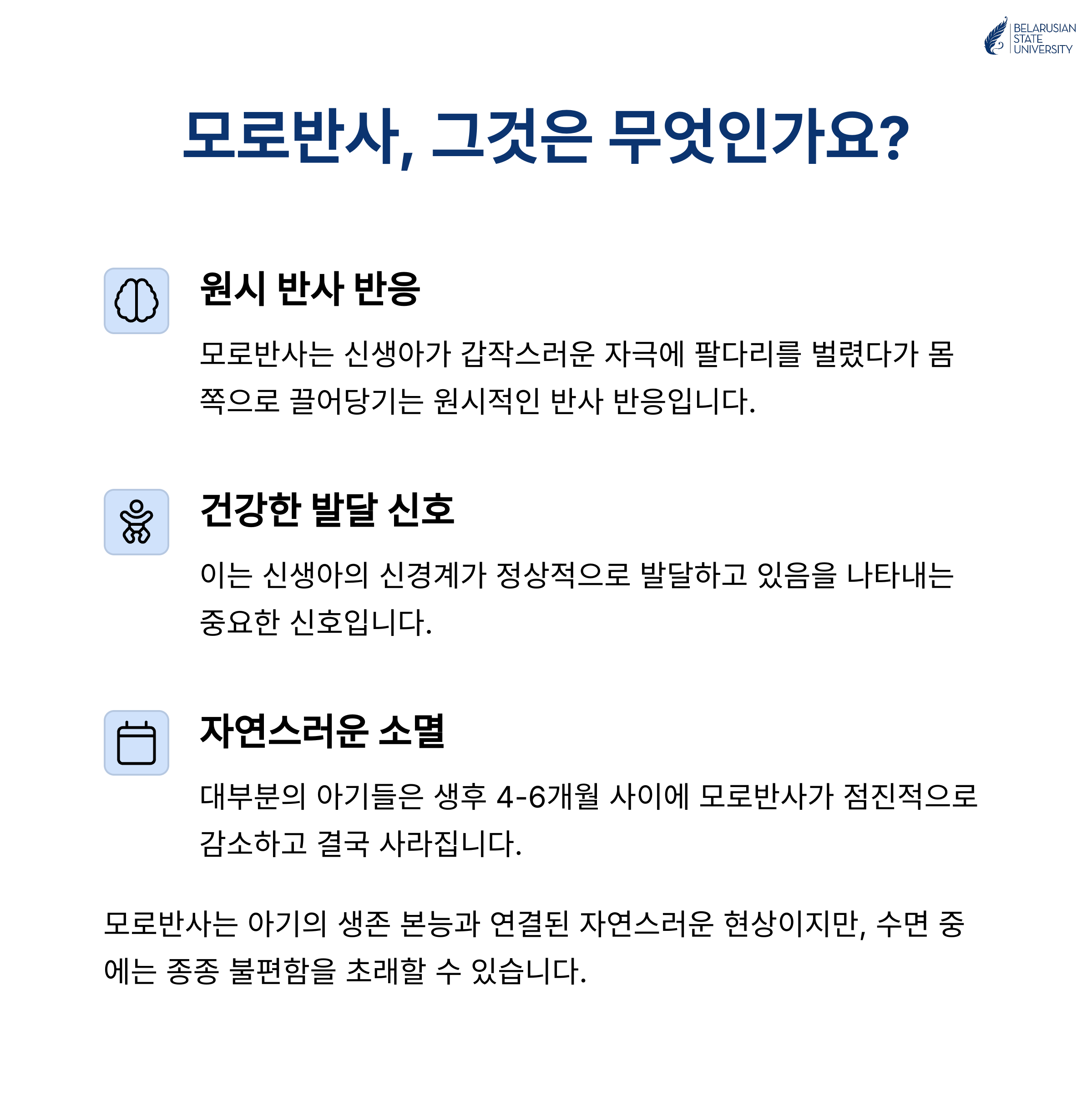 모로반사는 자연스러운 발달 반사로, 생후 6개월 전후로 대부분 사라집니다. 이후에도 계속된다면 소아과 상담이 필요해요.