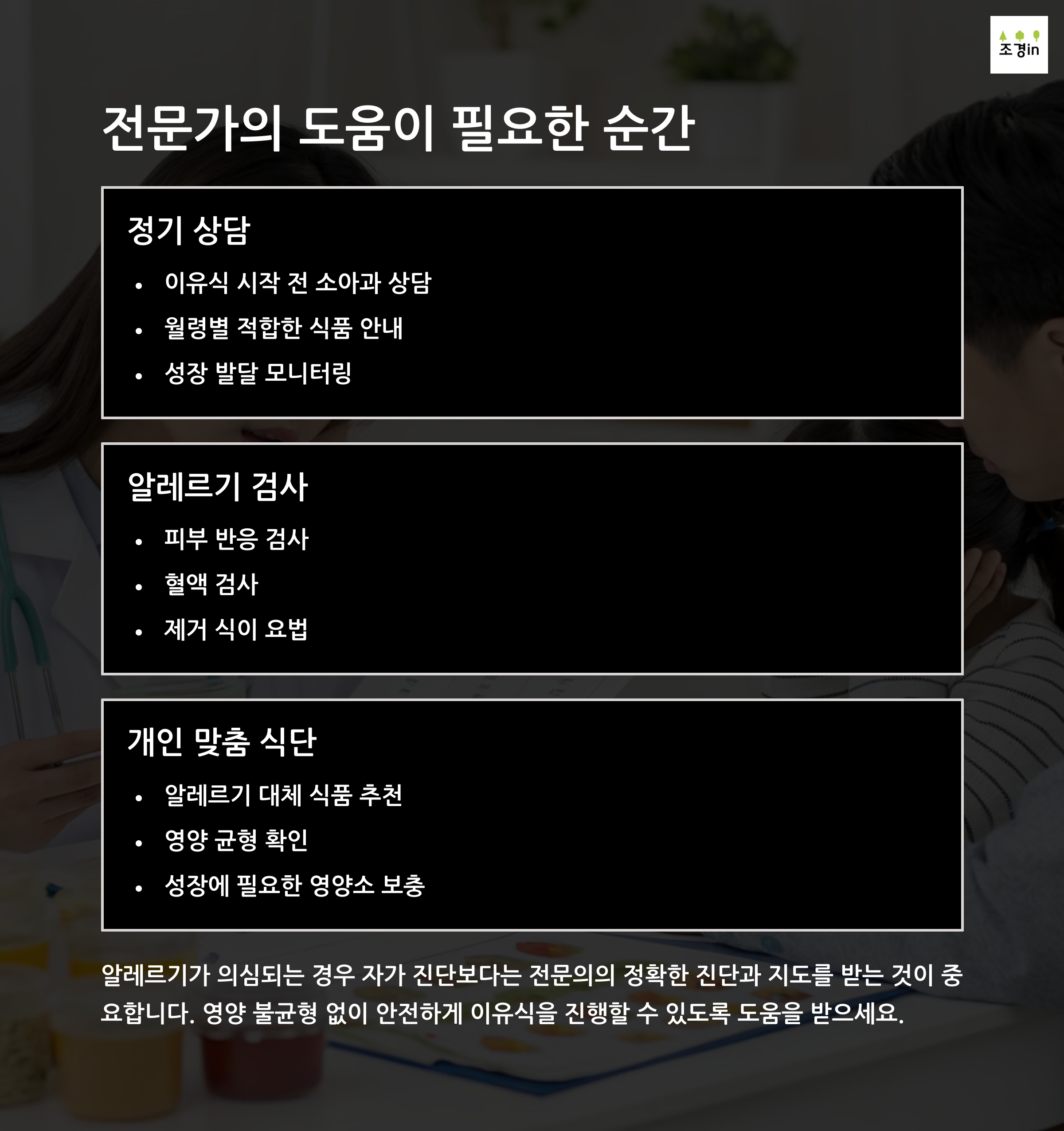 - 확진된 알레르기 식품은 일정 기간 후 전문의와 상의해 재도전