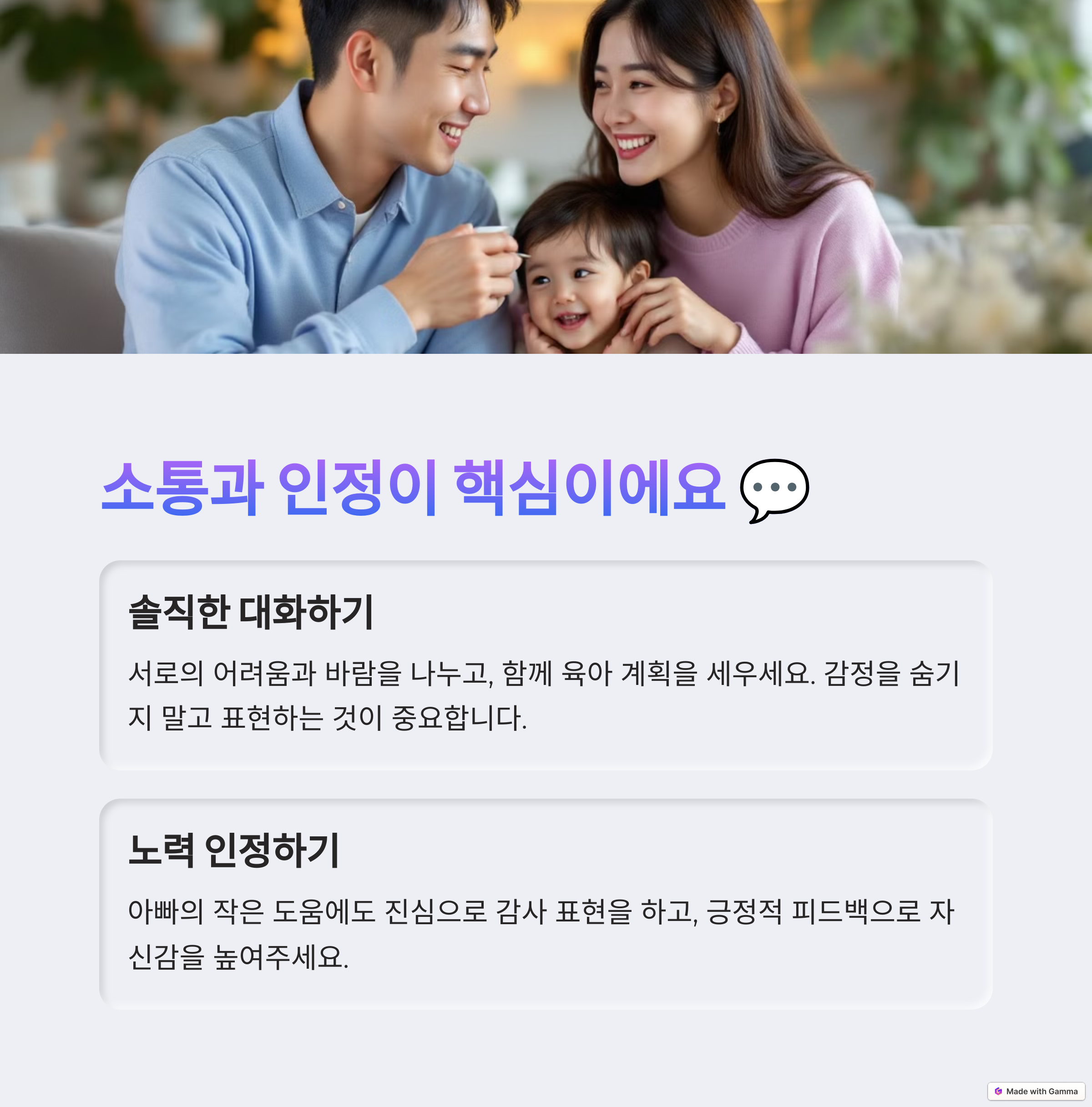 인정만으로도 참여할 수 있습니다. 육아를 업무처럼 명령하기보다는 자연스럽게 제안의 형태로 다가간다면, 아빠들도
