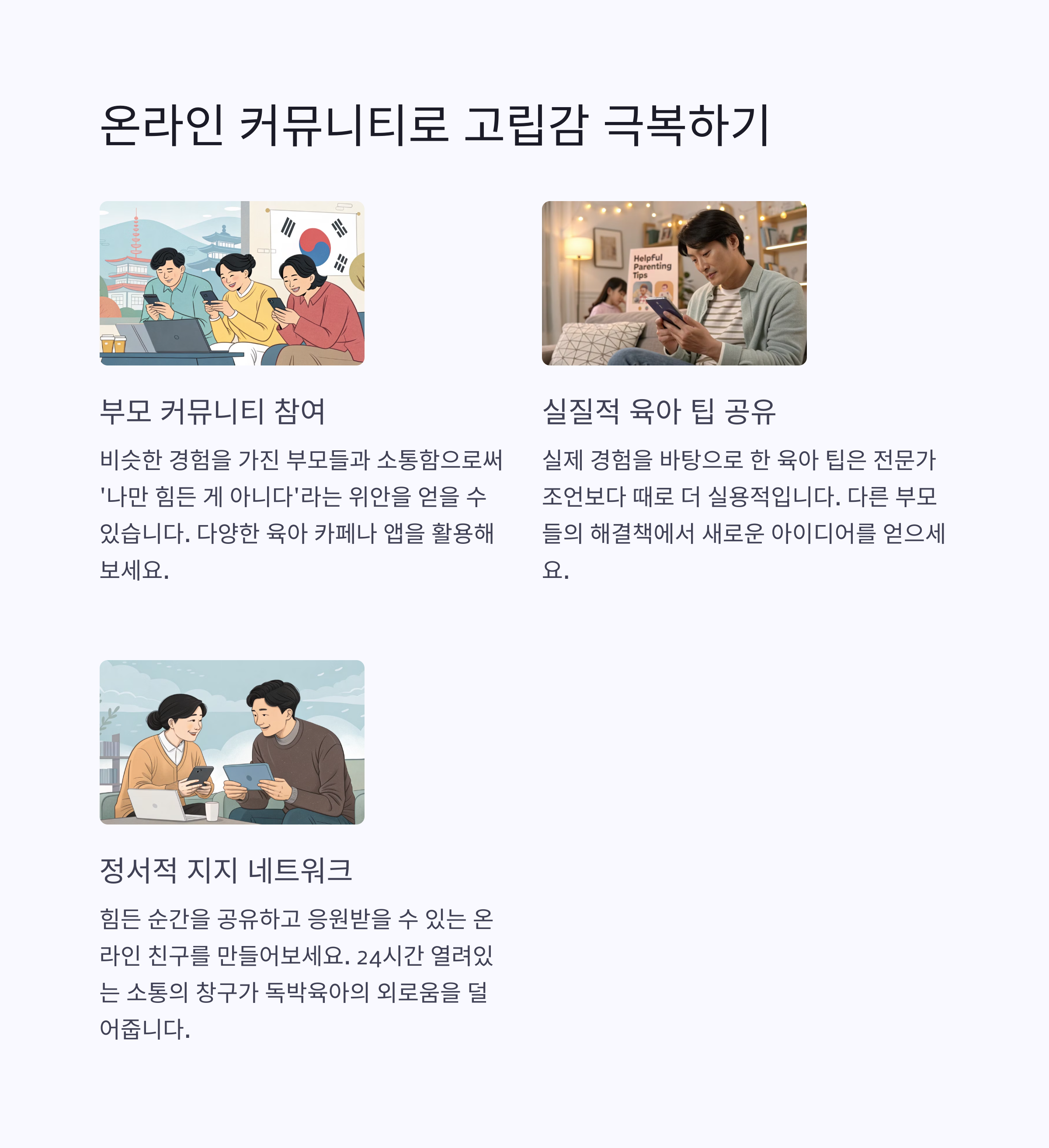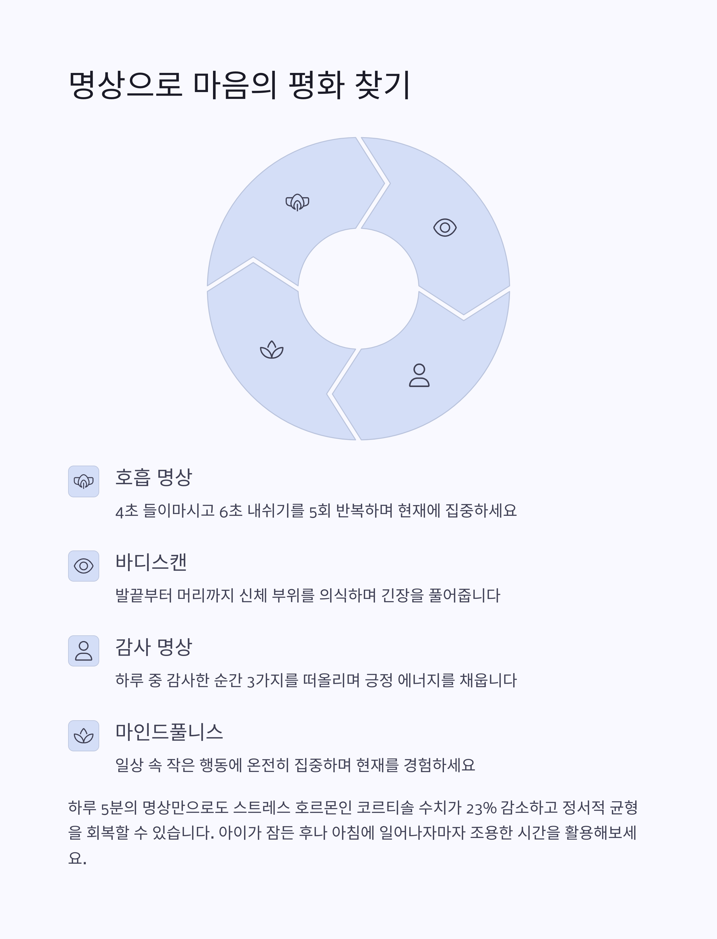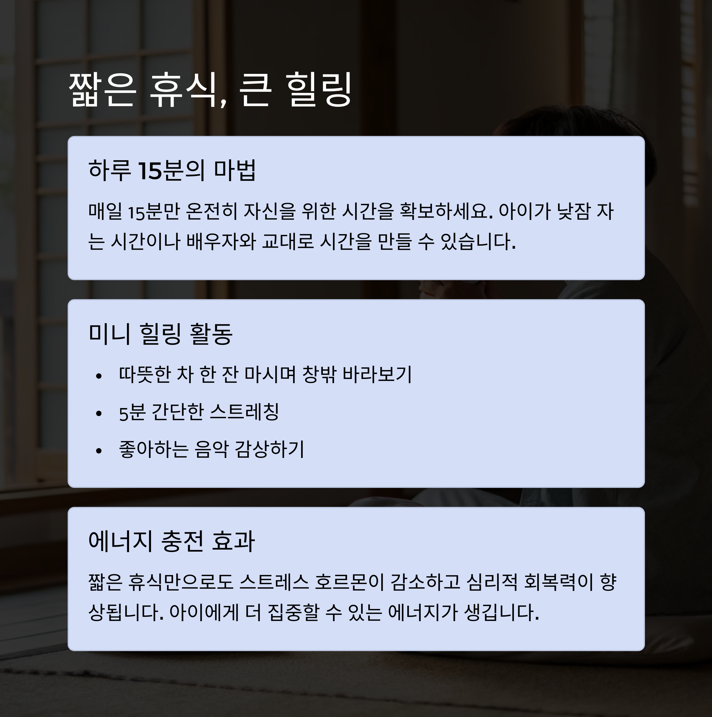반복되는 양육 상황, 독박육아 부담 | 짧은 휴식, 역할 분담, 명상과 자기 돌봄 | 부모 행복도 상승, 아이 정서 안정 효과 |