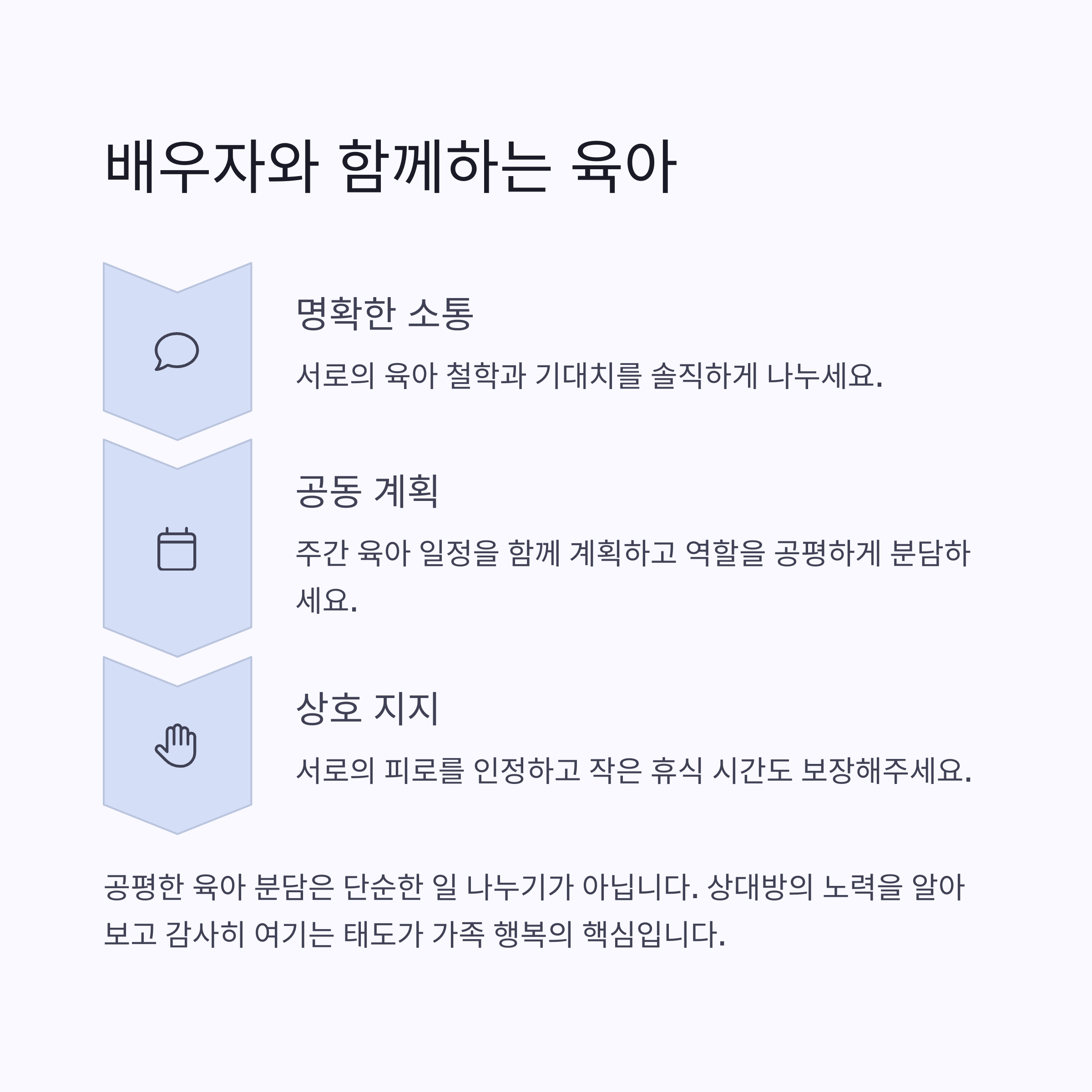 | 반복되는 양육 상황, 독박육아 부담 | 짧은 휴식, 역할 분담, 명상과 자기 돌봄 | 부모 행복도 상승, 아이 정서 안정 효과 |