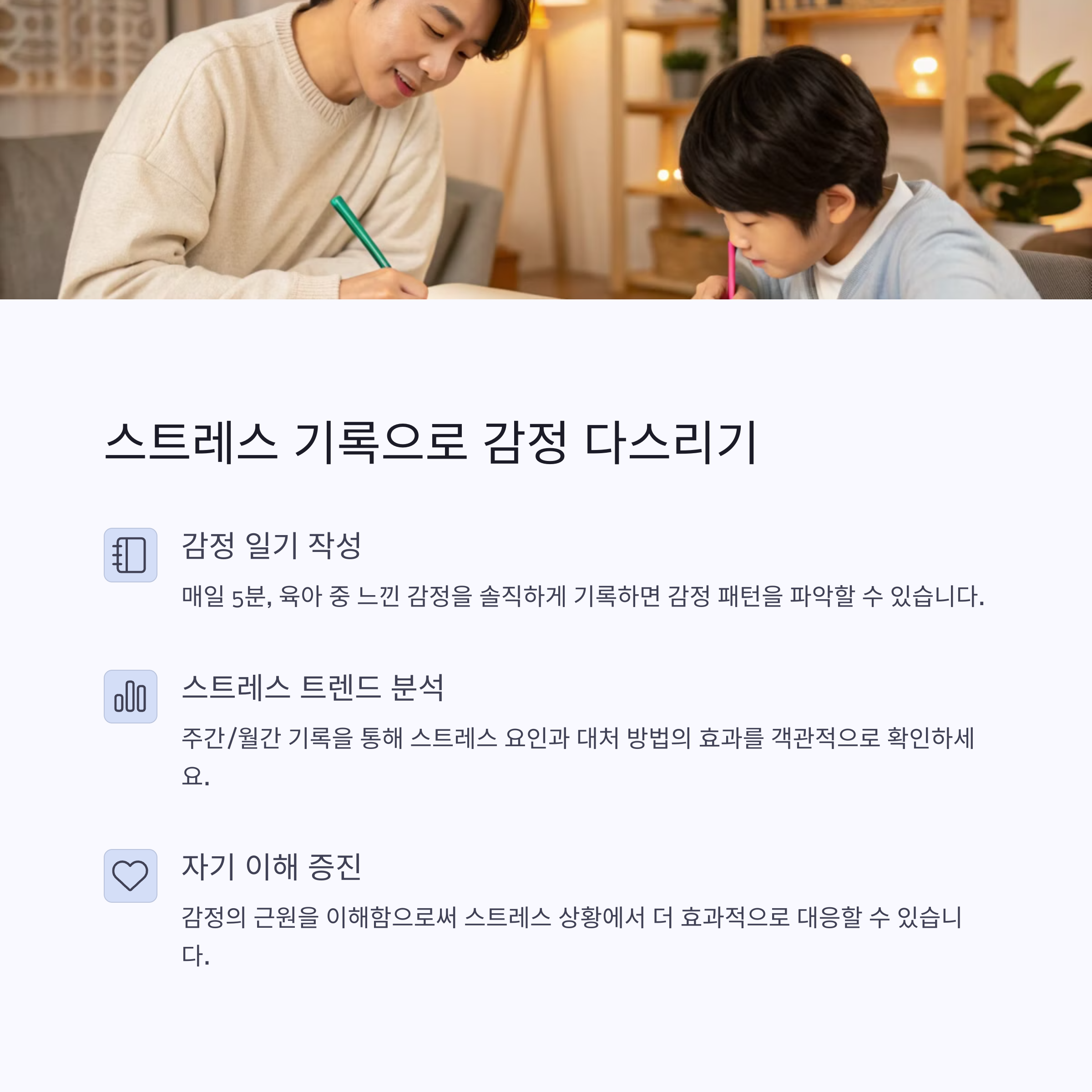 | 자존감 저하 및 가족 갈등 가능성 | 자의식 내려놓기, 스트레스 기록하기 | 양육 태도 긍정적 변화, 가족 관계 개선 |