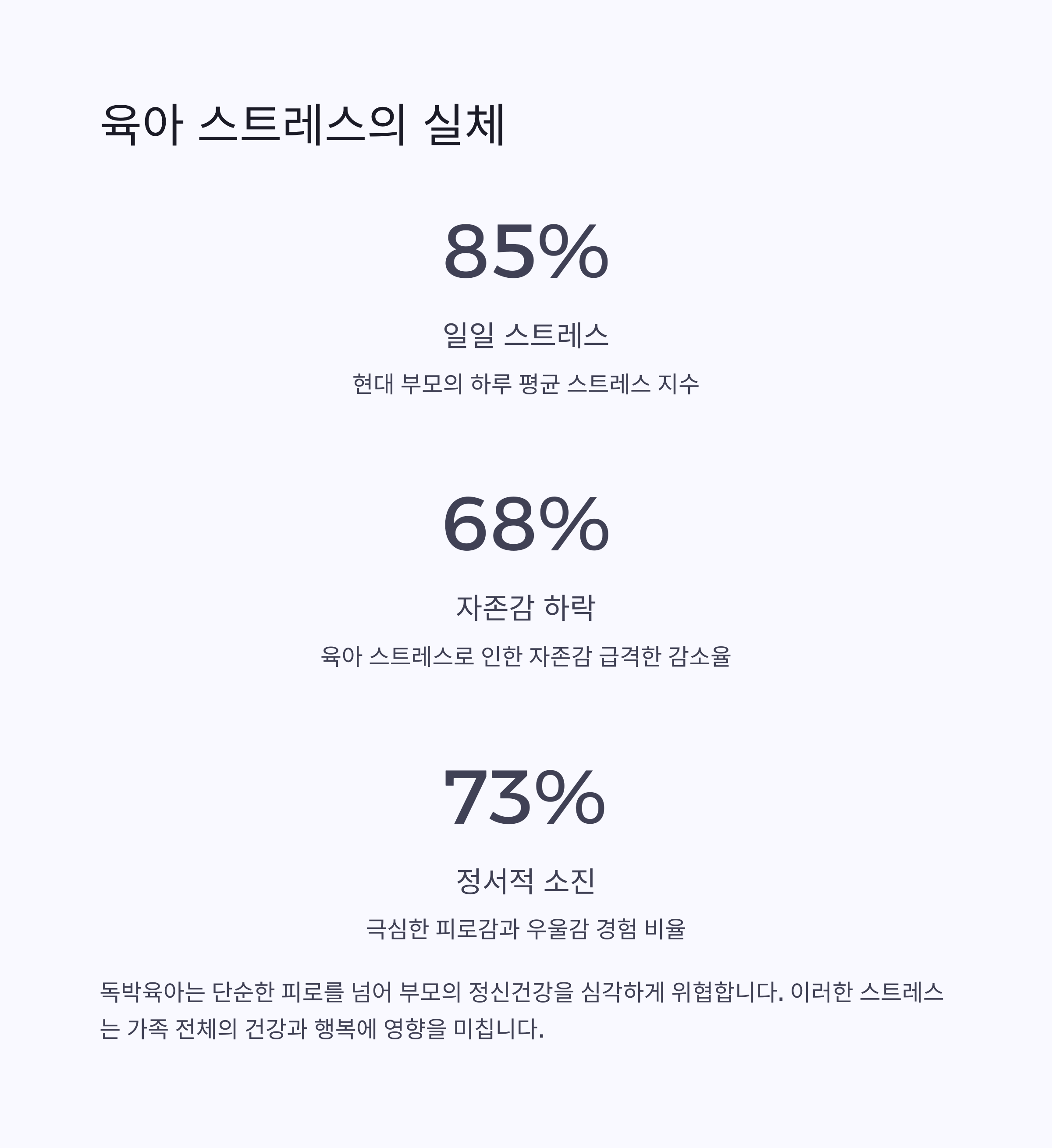 | 육아 스트레스 원인 | 반복되는 상황과 독박육아로 인한 부담이 주원인 |
