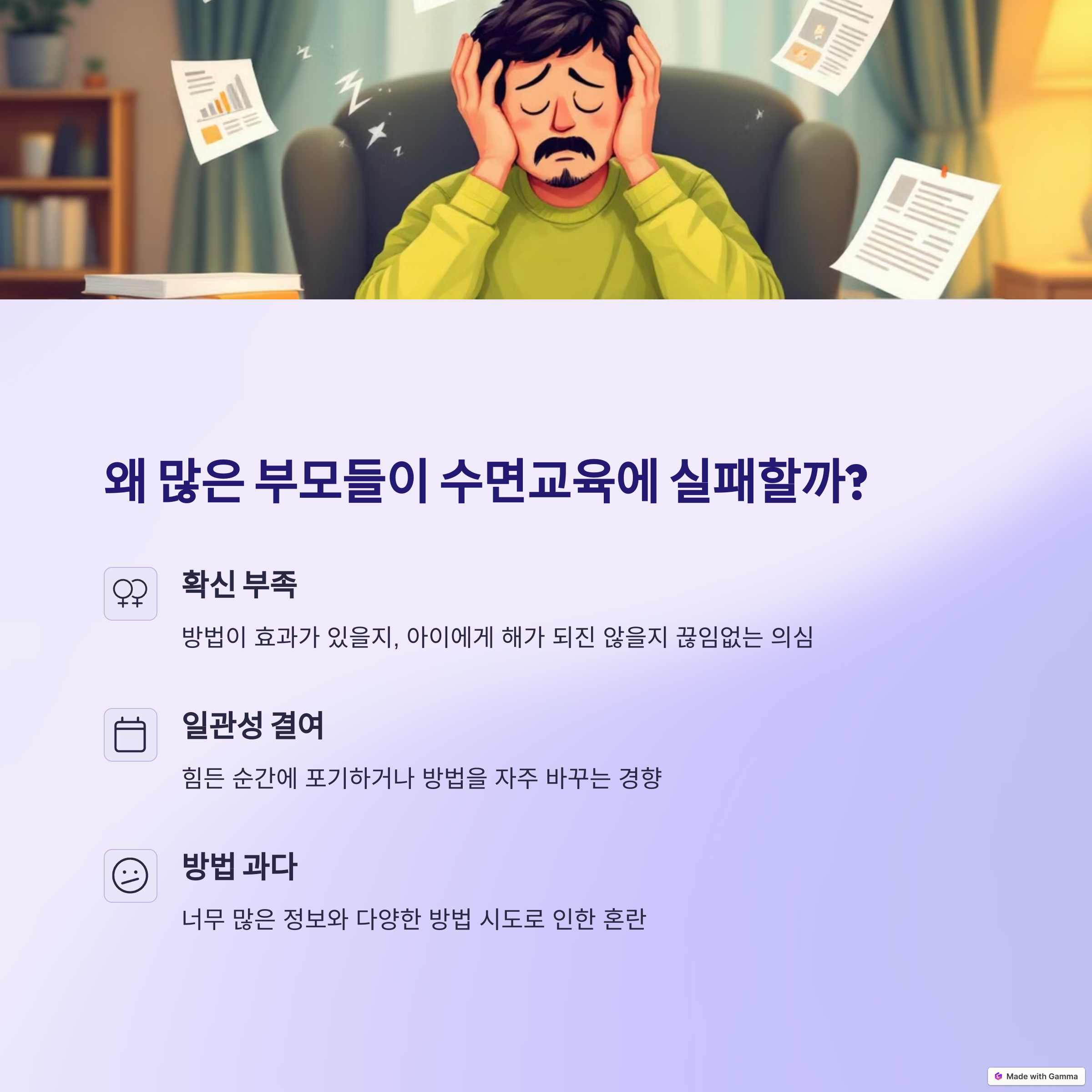 수면교육 실패 원인 | 확신 부족과 일관성 결여가 주요 원인입니다. |