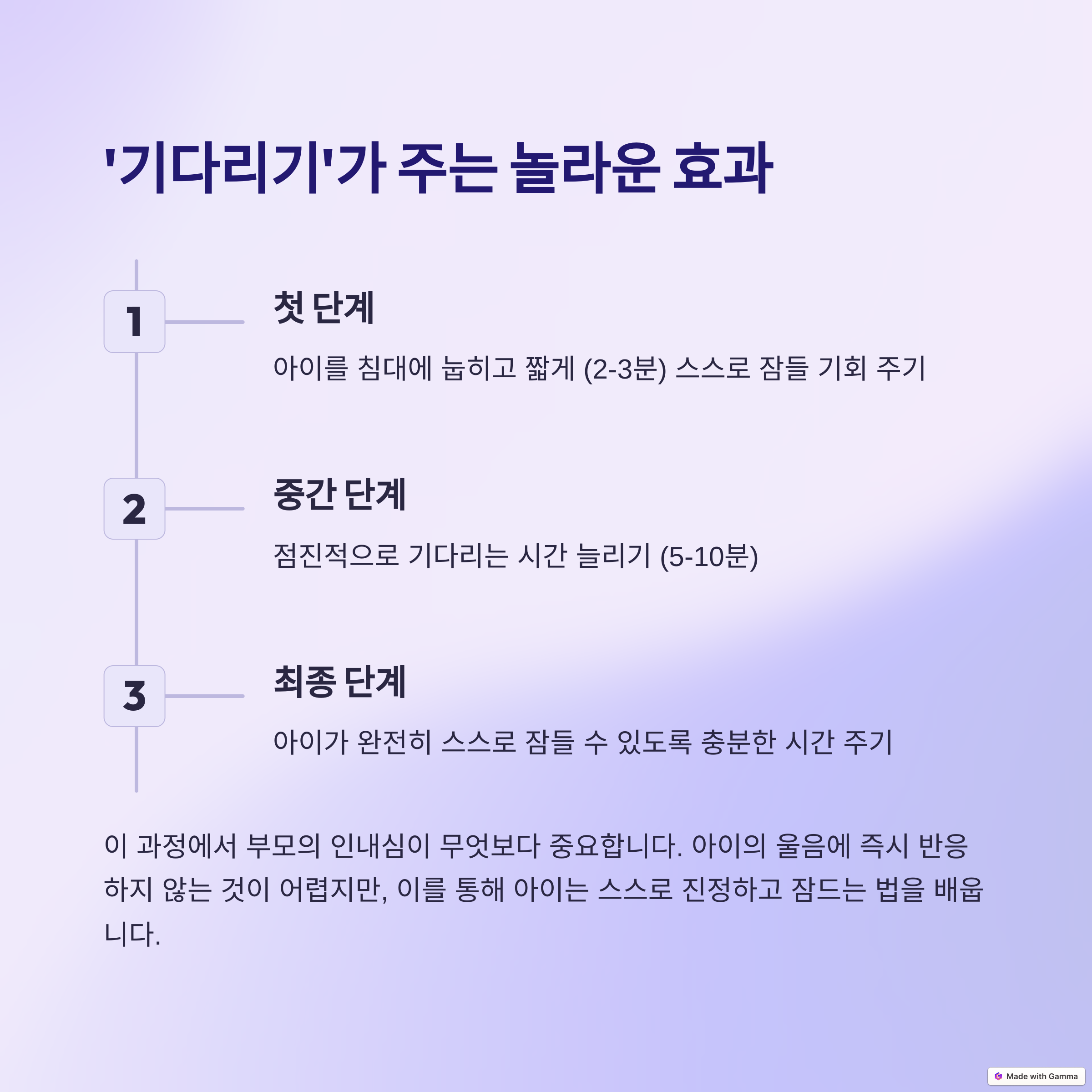 수면교육을 성공으로 이끄는 실천 방법은 구체적이고 명확합니다. 먼저, 수면의식 루틴을 만들어 아이가 잠들 시간임을 인식하게 해주세요. 낮에는 밝고 활기찬 환경을, 밤에는 어둡고 조용한 환경을 유지해 수면 리듬을 형성합니다. 또, 스스로 잠드는 연습을 돕기 위해 완전히 잠들기 전 침대에 눕히고 기다리는 연습을 지속하세요. 초반에는 울음과 갈등이 따르겠지만, 기다리기 시간표를 활용해 점차 기다리는 시간을 늘리면 긍정적 결과로 이어질 것입니다.
