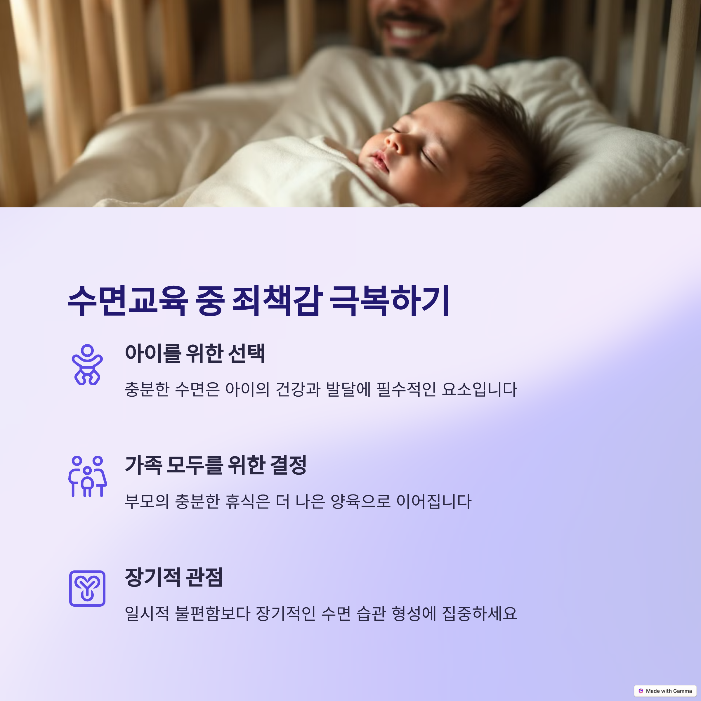 수면교육은 부모님과 아이 모두에게 도전이 될 수 있습니다. 많은 정보와 방법이 넘쳐나는 시대지만, 진정으로 중요한 것은 부모님의 확신과 일관성입니다. 다양한 방법론에 휘둘리지 말고, 우리 아이의 기질과 환경을 고려해 일관된 기준을 세워 실천해 보세요. 초기에는 힘들고 마음이 약해질 수 있지만, 인내심을 갖고 꾸준히 실천하면 반드시 변화가 찾아옵니다. 아이가 스스로 잠들 수 있게 되면, 부모님과 아이 모두가 더 행복한 하루를 맞이하게 될 것입니다.