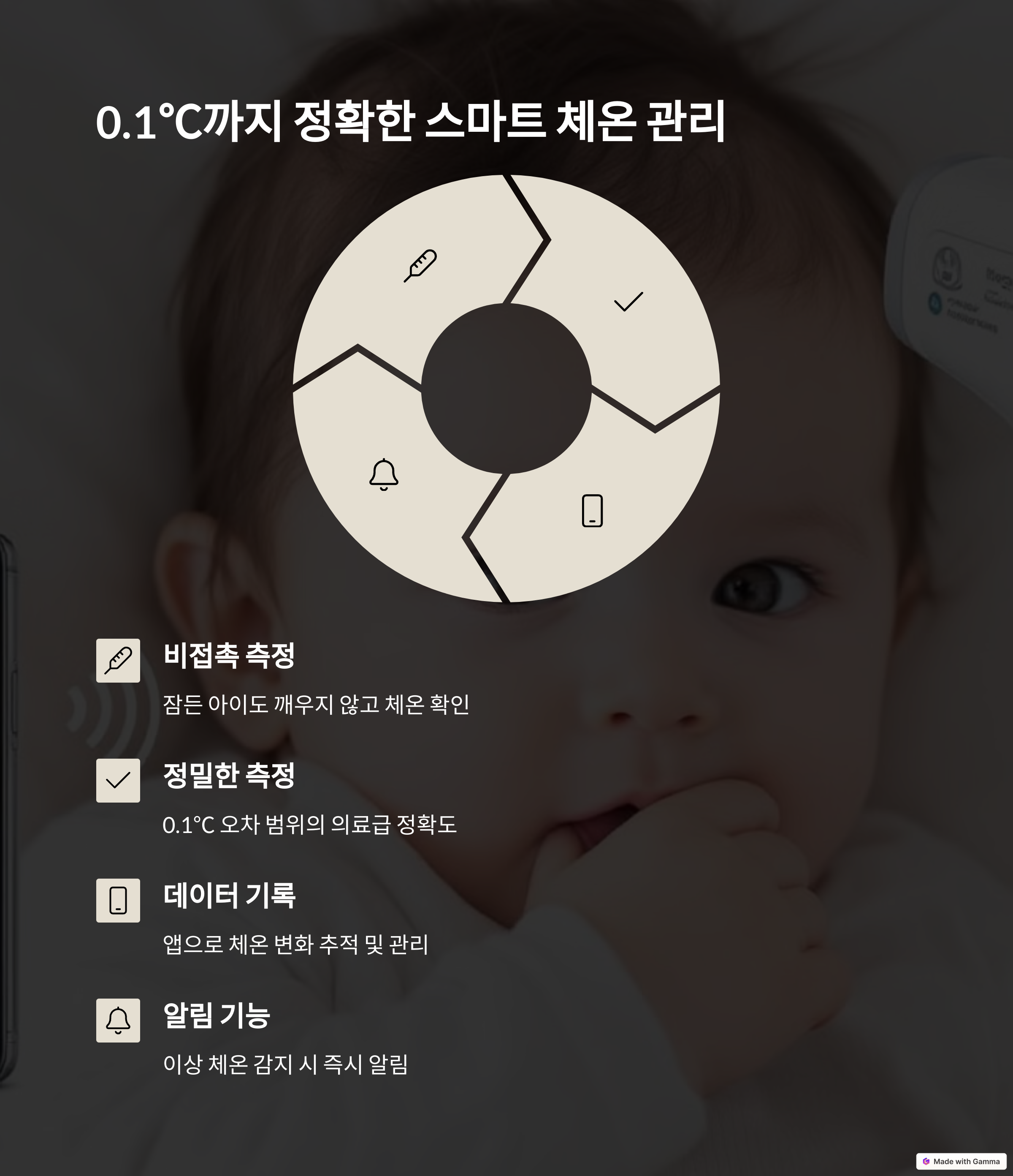 버튼 하나로 완성되는 수유 준비 | 아기 수면 패턴 실시간 확인 | 앱과 연동된 실시간 체온 확인 |