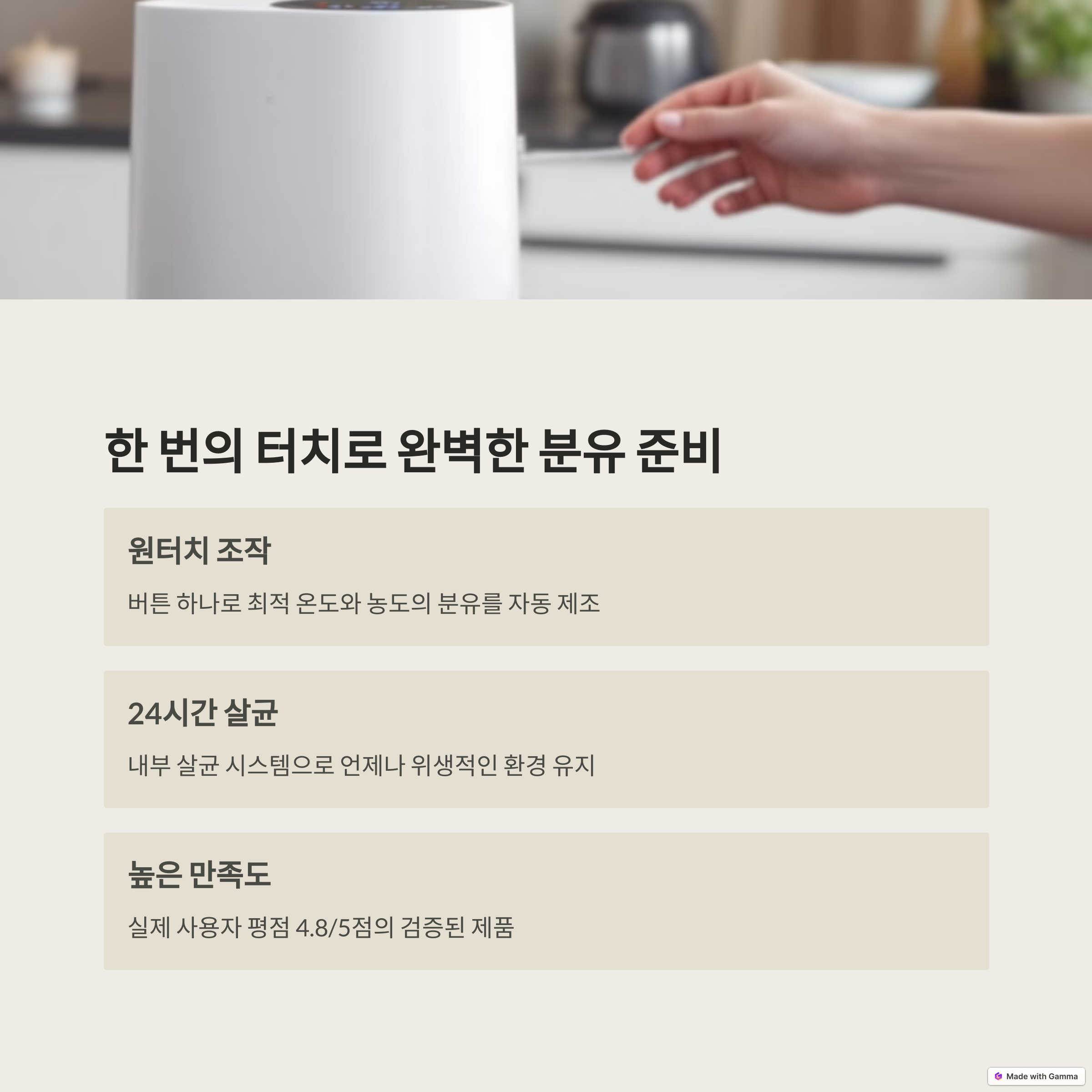 2025년 육아 시장에서 가장 핫한 아이템으로 떠오른 것은 바로 자동 분유 제조기입니다. 과거에는 새벽 수유 때 졸린 눈으로 물의 온도를 맞추고 분유 양을 재느라 많은 부모들이 고생했습니다. 하지만 이제는 버튼 하나로 완벽한 비율과 온도의 분유가 자동으로 만들어집니다. 특히 초보 부모님들에게는 수유 준비 시간이 대폭 줄어들면서 밤잠을 설치는 일이 크게 줄었습니다. 실제 사용자 후기에서도 수유 스트레스가 줄어들었다는 긍정적인 평가가 대부분입니다. 아이를 키우는 바쁜 부모들에게 이보다 더 효율적인 육아템은 찾기 어렵습니다.