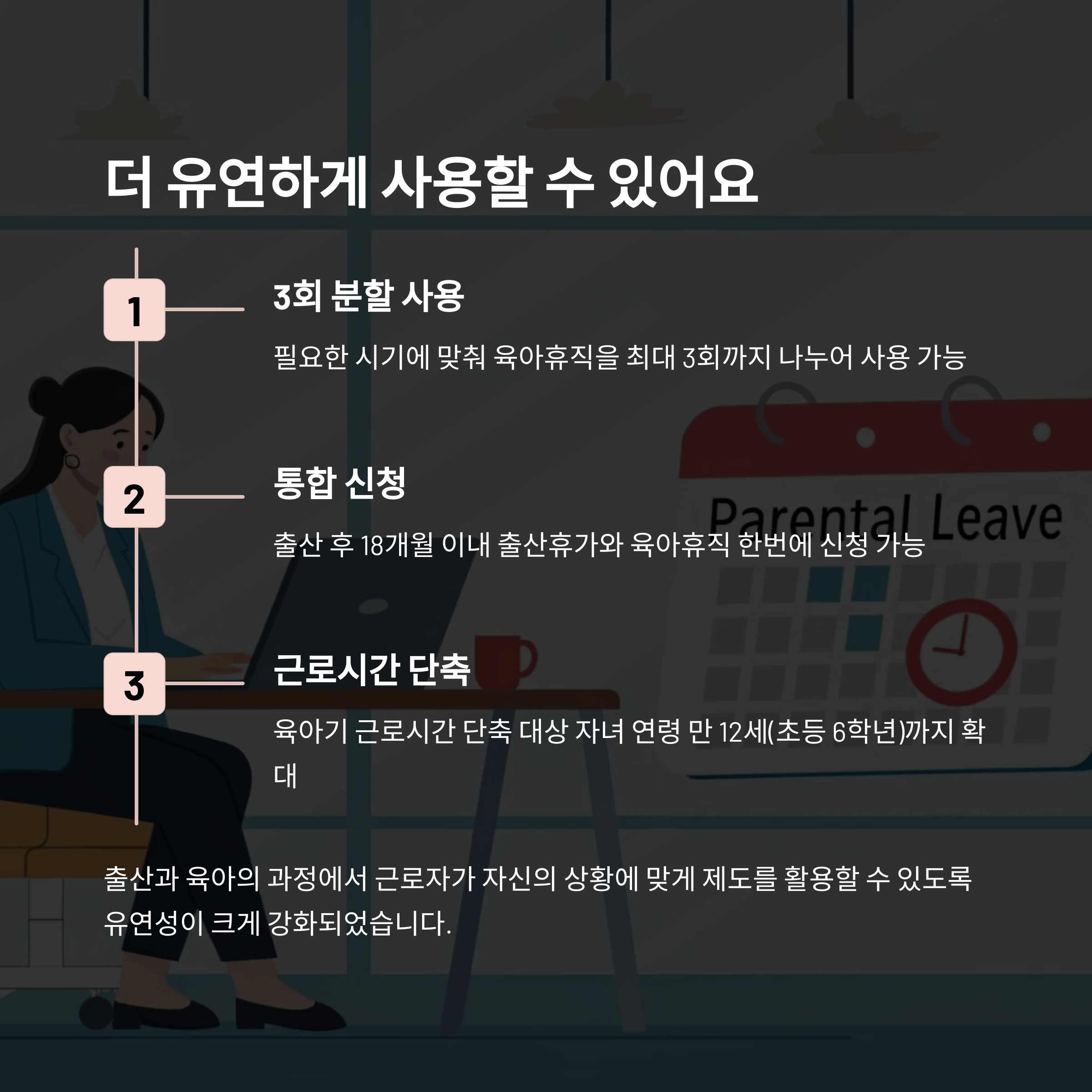 솔직히 이런 변화, 몇 년 전엔 상상도 못했죠. 이제 임신과 육아로 인한 경력 단절, 그 부담을 조금 덜 수 있게 되었습니다.